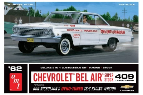 The 1962 Nicholson Bel Air is a historical super stock vehicle and a must-have for anyone interested in the history of racing! Fully paintable, it features an EXPANDED, authentically detailed, water-slide decal sheet featuring Dyno-Tuned racing graphics. Build it up 1 of 2 ways, stock or racing, with a 409 turbo-fire V8, optional intake manifolds, custom 5-spoke wheels, optional air cleaners, custom velocity stacks, chrome hub caps, Offenhauser valve covers, dual four-barrel carburetors, optional super stock headers, pad printed wide whitewall tires and Goodyear drag slicks, and more. Wrapped up nicely in ALL-NEW retro-styled packaging!