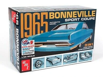 LOADED WITH OPTIONS: The 1965 Bonneville is a classic smooth-lined super cruiser. Fully paintable, it features ALL-NEW, authentically detailed water-slide decals. Build it stock, mild custom or full custom using optional features, including custom mag wheels, pad printed whitewall tires, custom tonneau cover, bucket seats, fully customized front and rear ends, stylized headlights, custom exhaust ports, and more. Wrapped up nicely in vintage-styled packaging!