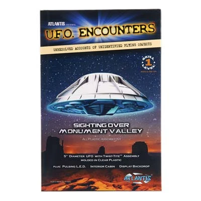 This is the UFO Encounters Monument Valley UFO Clear Edition with Light Plastic Model Kit from Atlantis. This model build is suitable for Ages 8 & Older