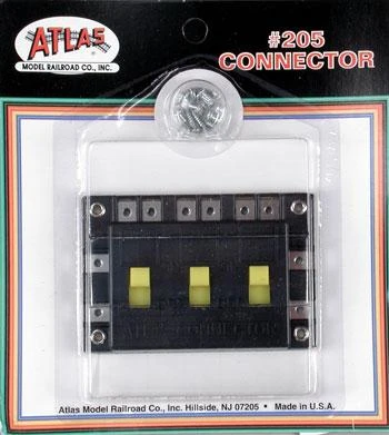 The Atlas Connector is a panel with three on-off switches for track sections (blocks) or accessories. It has three SPST (single-pole, single-pole) on-off switches in parallel. Use to control power to sidings, accessories, etc. Can be coupled together in any number. The connector has threaded screw hole terminals to accept 3-48 screws and Spade Tongue Solderless Connectors. Contacts are housed in a molded styrene housing that canbe directly connected to other Atlas Connectors. Includes mounting holes in the housing.