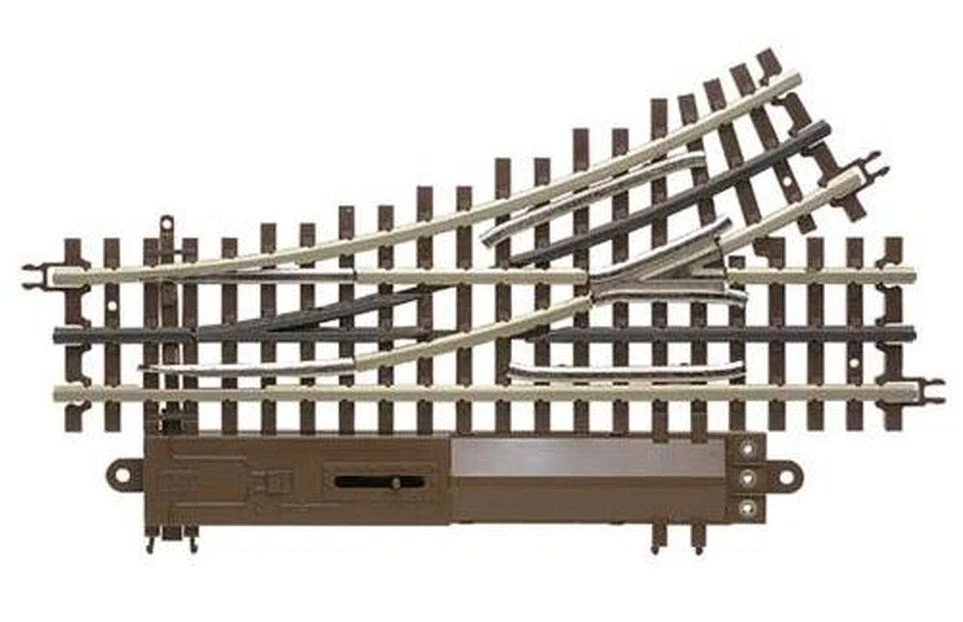 Atlas O 6075 O-36 left hand remote switch track has nickel silver rails with a blackened center rail and simulated wood ties.