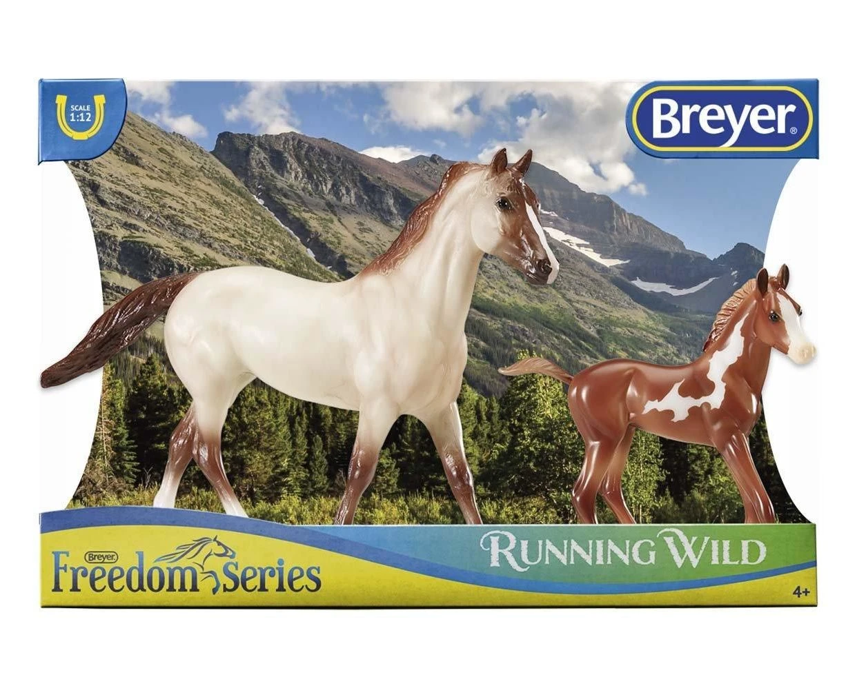 Mustangs are feral horses that are found in the American west. They descended from horses brought to the Americas in the 16th century by Spanish explorers. Today they’re protected by the Wild Free-Roaming Horses and Burro Act, which calls mustangs “living symbols of the historic and pioneer spirit of the West.” This set includes a red roan stallion and his chestnut pinto foal.