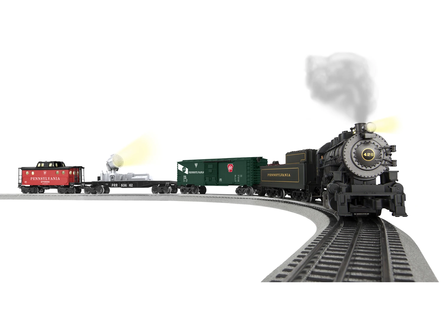 The Pennsylvania Keystone Special is back and better than ever! Dressed in realistic brunswick green and equipped with the LionChief® system, this locomotive runs by remote control which gives you easy access to realistic train sounds and announcements and train control at the push of a button or you can run this consists with your smart device by using our LionChief® app. All cars feature the popular Pennsylvania name and markings, and a searchlight car is also included to add to the fun.