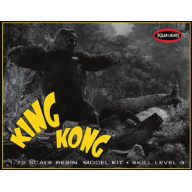 This is a Polar Lights 923 1:72 King Kong Resin Kit. One of the most iconic movie figures of all time comes to life in the form of an all-new resin King Kong model kit from Polar Lights. The kit depicts victorious King Kong from the classic 1933 film beating his chest over a defeated Tyrannosaurus Rex. It features an authentic likeness and superb detail as rendered by sculptor extraordinaire, Gabriel Marquez. Monster figure modelers are sure to love this one! Kit Features: Iconic 1933 King Kong, accurate likeness and incredible detail, T-Rex base and dynamic pose, approximately 9โ tall.