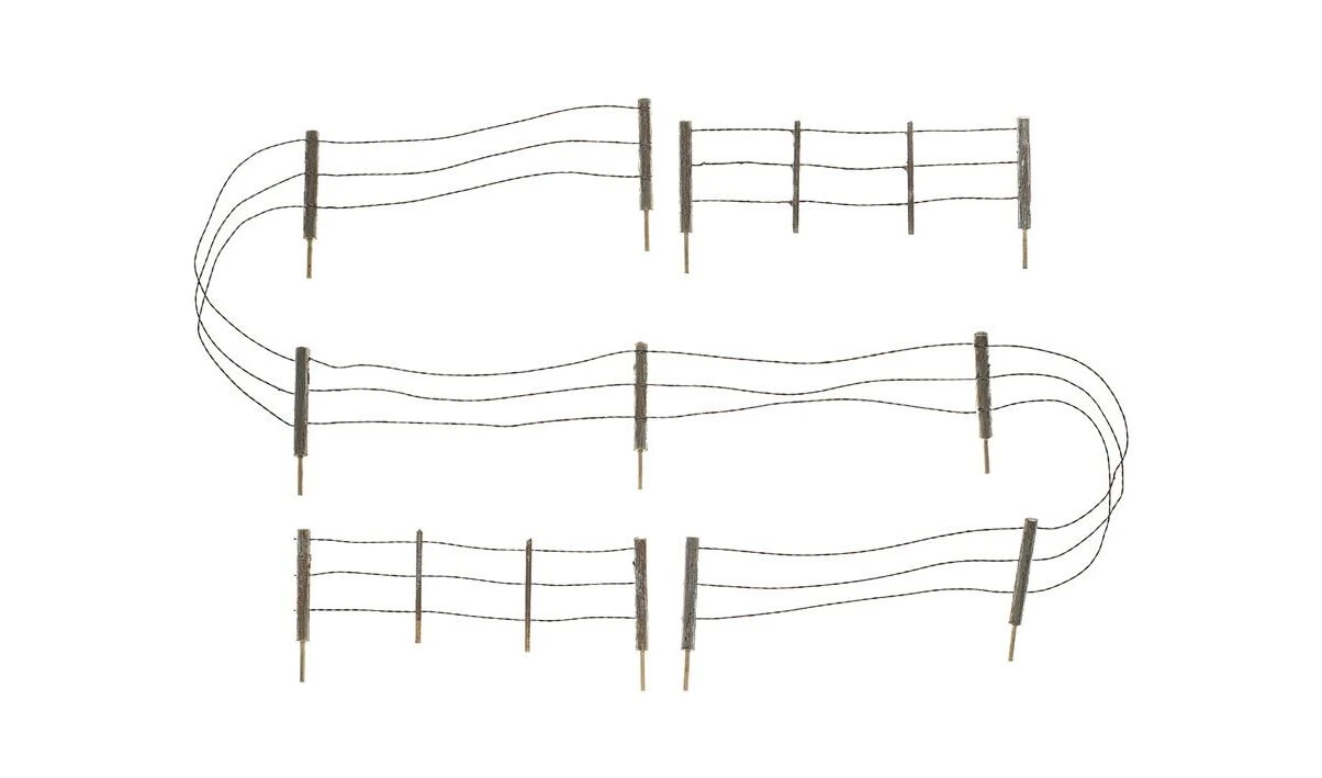 Line the edge of a pasture with handmade, pre-strung O scale Barbed Wire Fence Barbed Wire Fences come with loose corner post support pieces and feature a double-gate with detail hinges. Simply place the fencing around an area, and then set the planter pins, drill and glue.