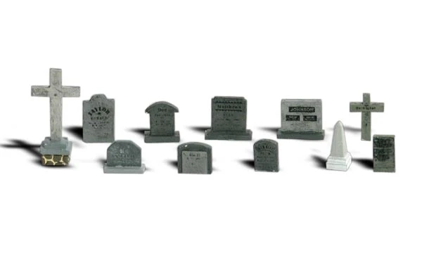 Eleven pieces are included in this assortment of square, rounded, cross and obelisk tombstones.