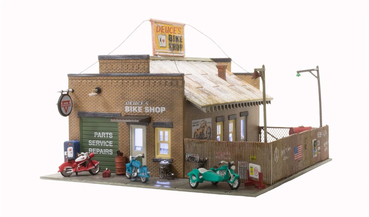 Spice up the ‘speedy’ side of your town with a dash of historical flare. Deuce’s Bike Shop represents a nostalgic ‘easy rider’ setting with incredible detail. Exterior details include a weathered ‘metal’ roof and siding, signs and decals, an old pop machine and a fenced yard filled with a junkyard dog and old bike parts. See photos for footprint.