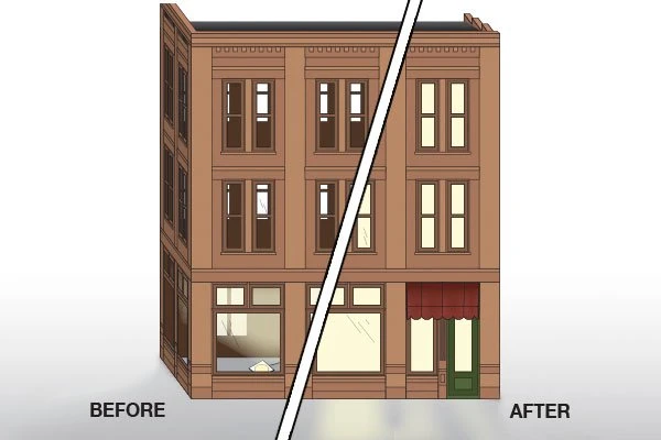 Diffuses light evenly throughout when lights are on and eliminates the need for a building interior. Blocks outside view through the windows of an empty building, while still allowing light to shine through the windows from the inside.